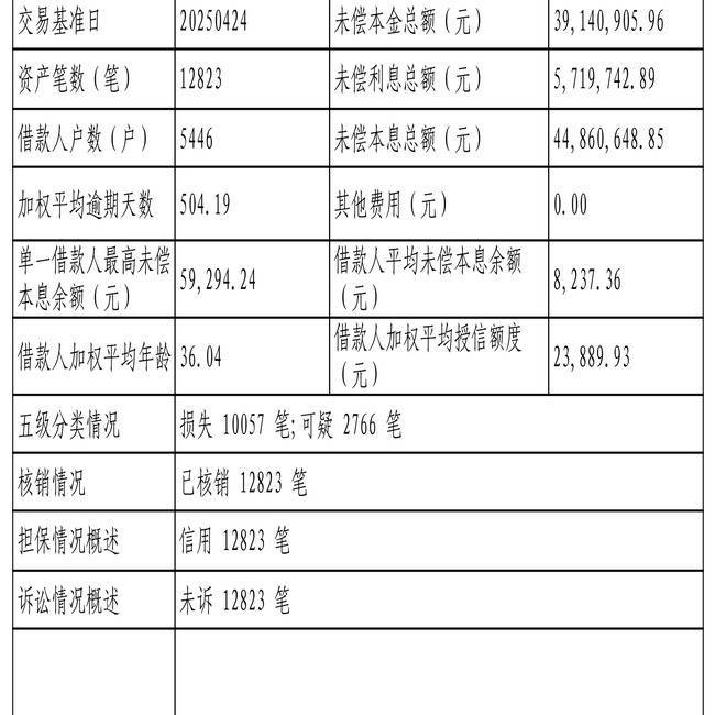 公告显示,该笔不良贷款未偿本息总额4486.06万元,涉及资产笔数12823笔,借款人户数5446户,加权平均逾期天数504.19天,单一借款人最高未偿本息余额5.93万元。